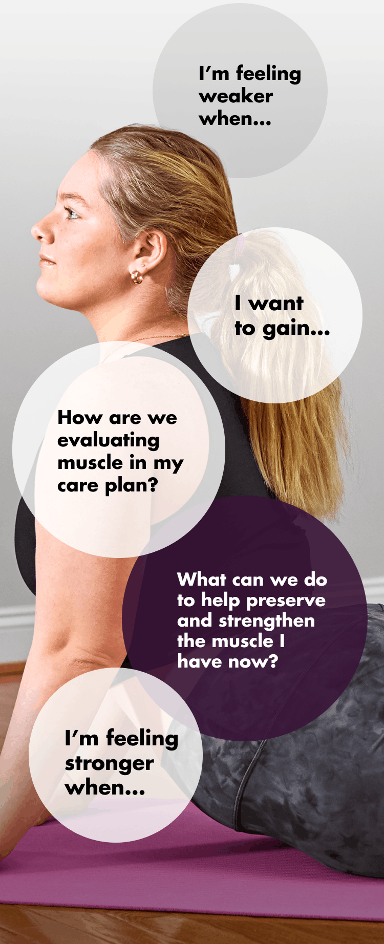 You and your caregivers know how to advocate best, and your care team is in your corner. The more you can clearly share what’s changing, what’s being lost, and your interest in including muscle health in your treatment plan, the better they can support you and your strength goals.